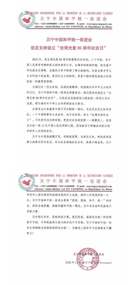 • 贝宁中国和平统一促进会发表声明坚定支持设立台湾光复80周年纪念日 2025-11-17